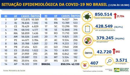 Brasil tem 42.720 mortos pela covid-19 e 850.514 casos confirmados oficialmente. 428.549 pessoas estão em acompanhamento médico e 379.245 estão curadas.