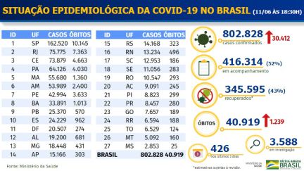 Brasil tem 40.919 mortos pela covid-19 e 802.828 casos confirmados.